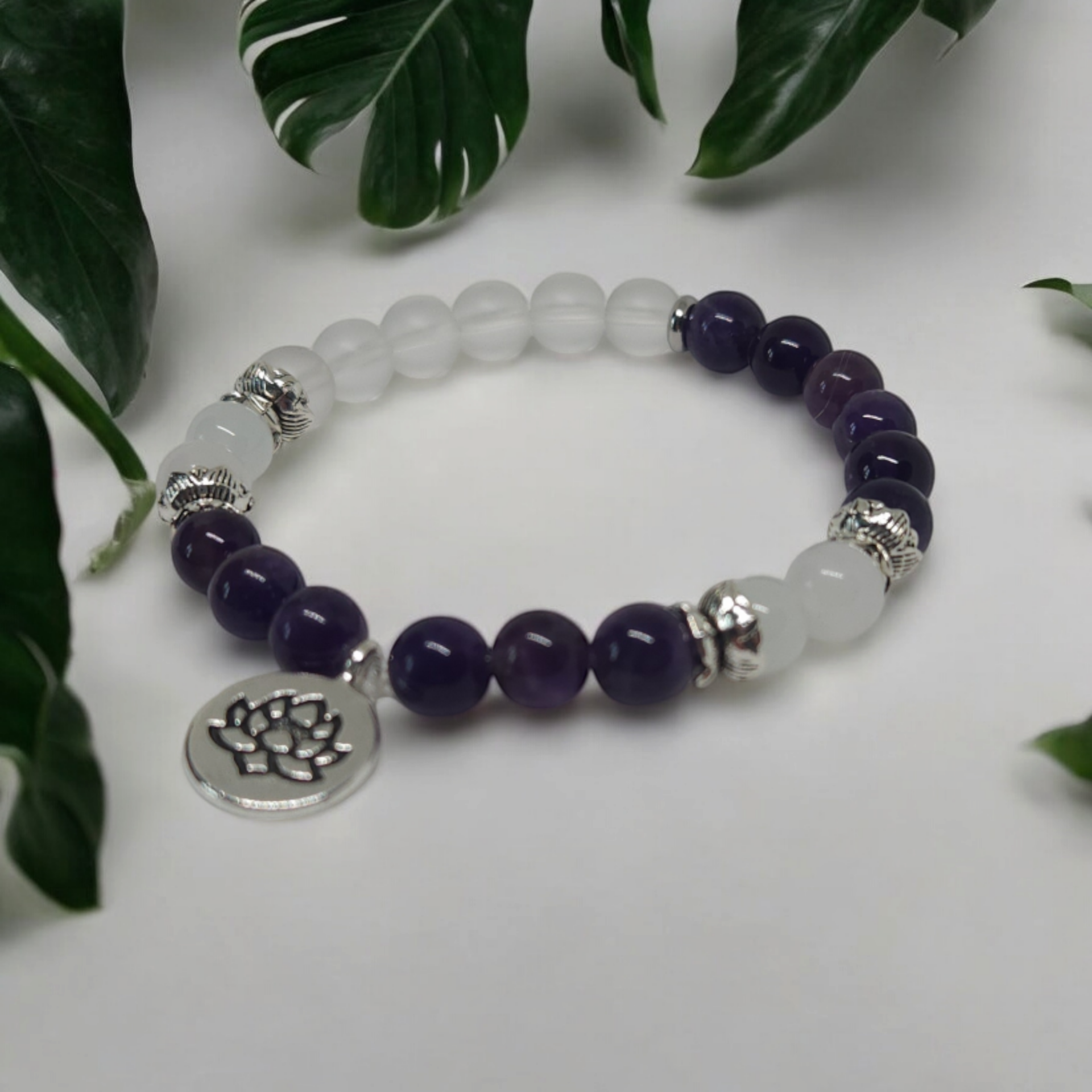 Brume est fait d'améthyste et de quartz neige 8mm. Le tout agrémenté par une fleur de lotus.