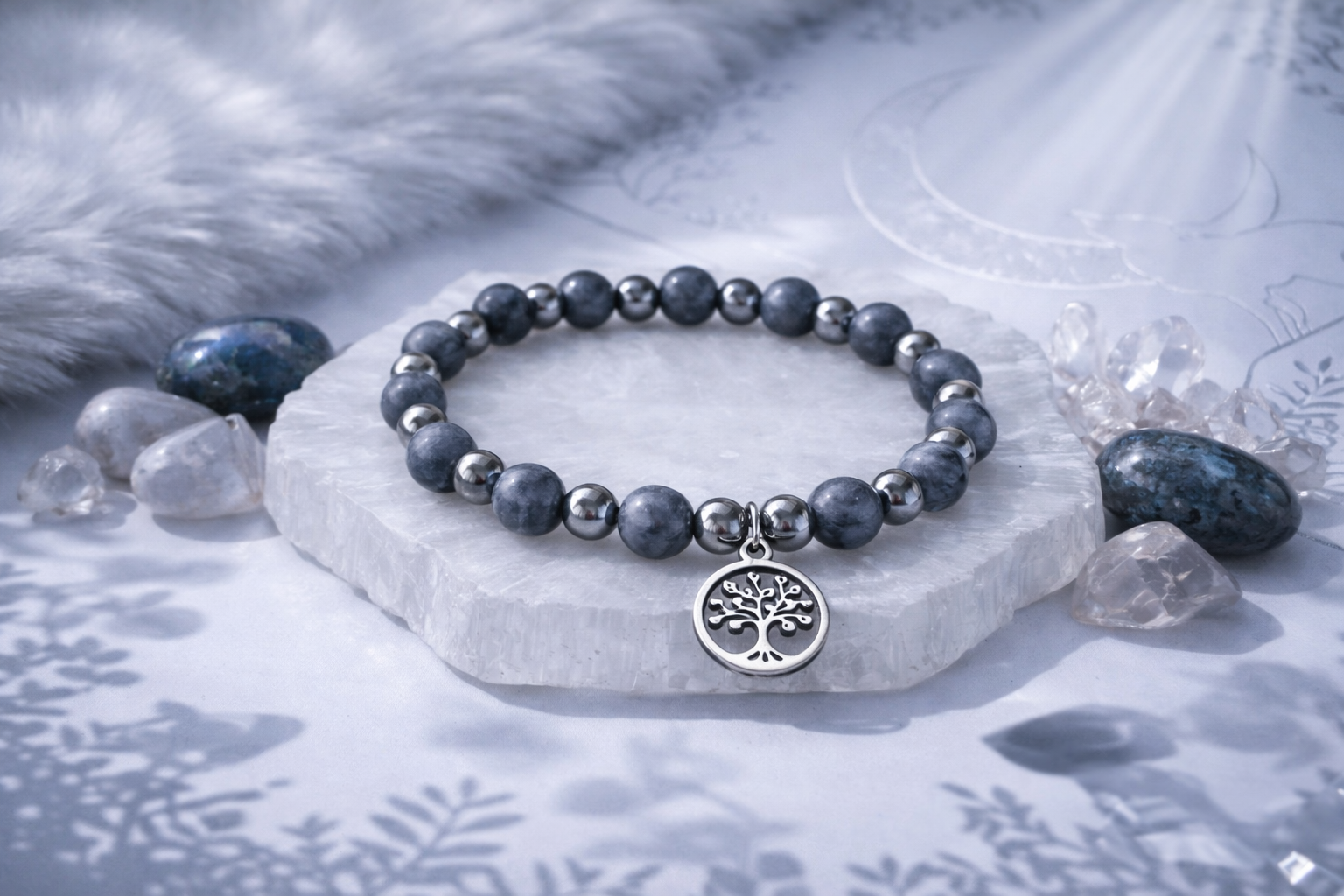 Ce bracelet associe la profondeur mystérieuse de la larvikite à la force protectrice de l’hématite.